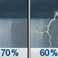 Temperature: 65°F Wind Speed: 16 mph Wind Direction: S Forecast: Rain showers likely before 1pm, then a chance of showers and thunderstorms. Mostly cloudy, with a high near 65. Chance of precipitation is 70%. |