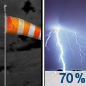 Temperature: 74°F Wind Speed: 14 to 18 mph Wind Direction: E Forecast: Showers and thunderstorms likely. Mostly cloudy, with a high near 74. East wind 14 to 18 mph. Chance of precipitation is 70%. |