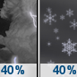 Temperature: 39°F Wind Speed: 6 to 14 mph Wind Direction: WSW Forecast: A chance of showers and thunderstorms before 3am, then a chance of rain and snow showers. Mostly cloudy, with a low around 39. |