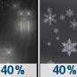 Temperature: 31°F Wind Speed: 2 mph Wind Direction: W Forecast: A chance of rain and patchy fog before 1am, then patchy fog and a chance of rain and snow. Mostly cloudy. Low around 31, with temperatures rising to around 33 overnight. West wind around 2 mph. Chance of precipitation is 40%. New rainfall amounts less than a tenth of an inch possible. |