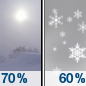 Temperature: 4°F Wind Speed: 6 to 18 mph Wind Direction: S Forecast: A chance of snow after midnight. Mostly cloudy, with a low around 4. South wind 6 to 18 mph. Chance of precipitation is 30%. |