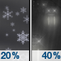 Temperature: 36°F Wind Speed: 13 to 18 mph Wind Direction: N Forecast: A chance of snow. Mostly cloudy, with a high near 36. Chance of precipitation is 50%. |