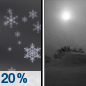Temperature: 20°F Wind Speed: 5 mph Wind Direction: NE Forecast: Snow. Mostly cloudy, with a low around 20. Northeast wind around 5 mph. Chance of precipitation is 80%. New snow accumulation of 1 to 3 inches possible. |