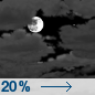 Temperature: 33°F Wind Speed: 15 to 20 mph Wind Direction: N Forecast: Mostly cloudy, with a low around 33. North wind 15 to 20 mph, with gusts as high as 30 mph. Chance of precipitation is 20%. |