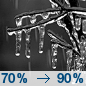 Temperature: 23°F Wind Speed: 3 mph Wind Direction: E Forecast: Freezing rain. Cloudy, with a low around 23. Chance of precipitation is 90%. New ice accumulation of less than half an inch possible. |