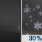 Temperature: 19°F Wind Speed: 9 mph Wind Direction: NW Forecast: A chance of snow. Mostly cloudy, with a low around 19. Chance of precipitation is 30%. |